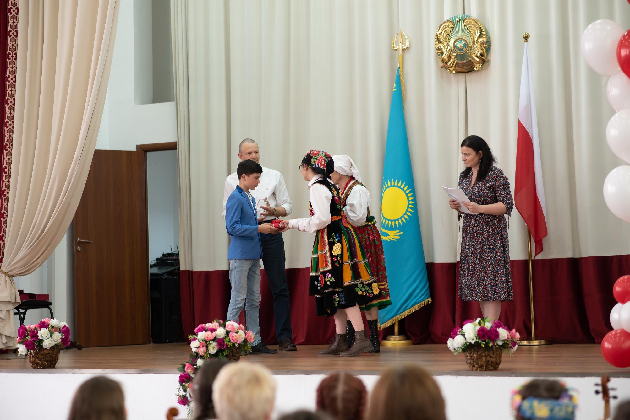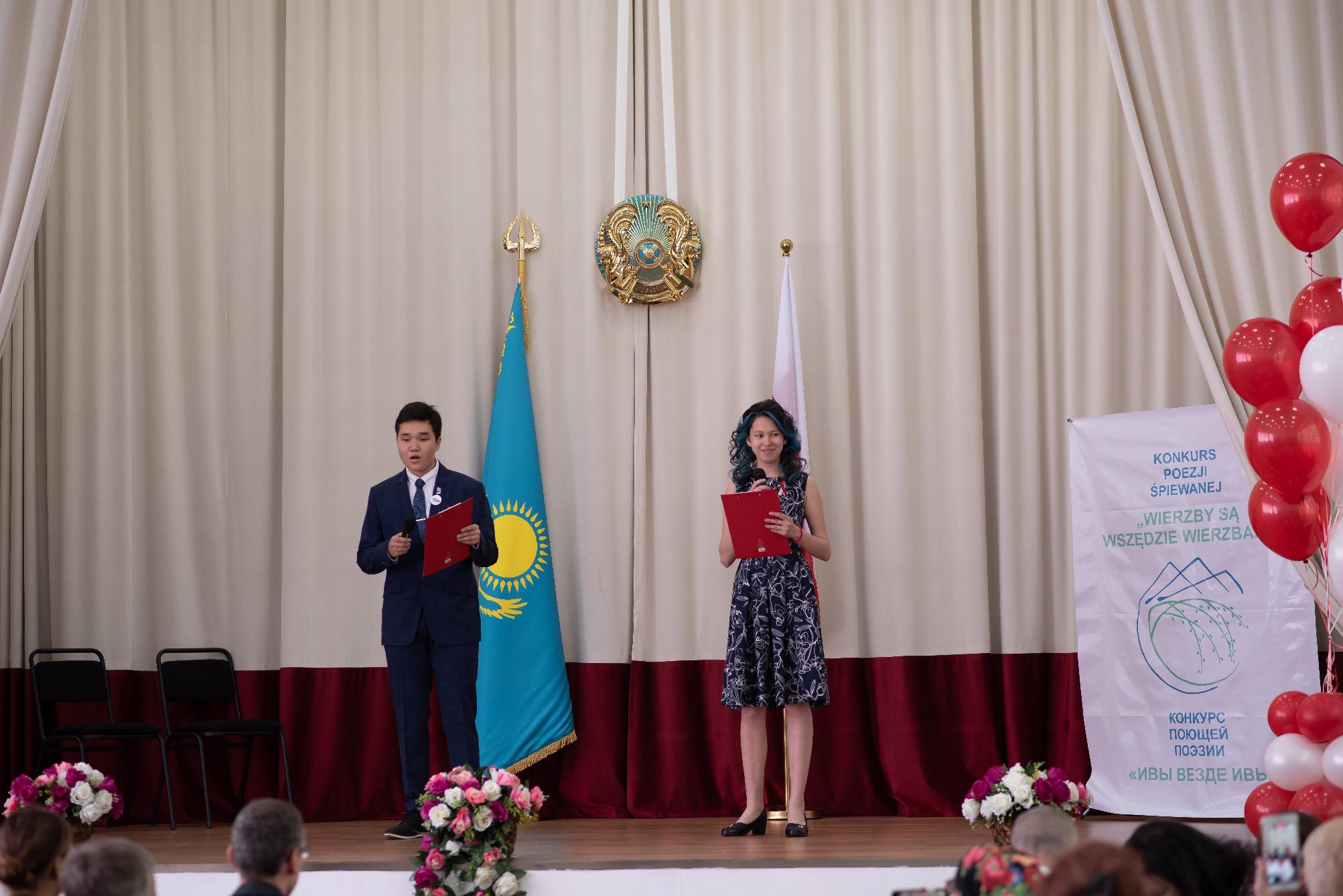 Odrębne słowo należy się osobom prowadzącym imprezę – uczniom polskich klas: Zofii Zinkiewicz (kl. 11) i Omarchanowi Dżekebajewowi (kl. 10). Konferansjerzy zapowiadali poszczególne punkty programu w języku polskim i rosyjskim, robiąc to z iście estradową swadą, za co należą im się szczególne słowa uznania.