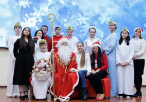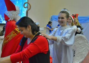 Święty Mikołaj mógł odwiedzić Taszkent i przynieść dobrą energię uzbeckiej Polonii dzięki pomocnikom, czyli pracy członków Stowarzyszenia Świetlica Polska na czele z prezesem Olegiem Skuridinem, nauczycielką skierowaną przez ORPEG do pracy dydaktycznej w Uzbekistanie Agnieszką Mikulec oraz choreografem Władysławem Mireckim. To właśnie oni przygotowali publiczność na spotkanie ze świętym Mikołajem. Był spektakl bożonarodzeniowy, wesołe tańce oraz piękna scenografia z biało-czerwoną choinką i kolorowymi błyszczącymi szopkami krakowskimi.