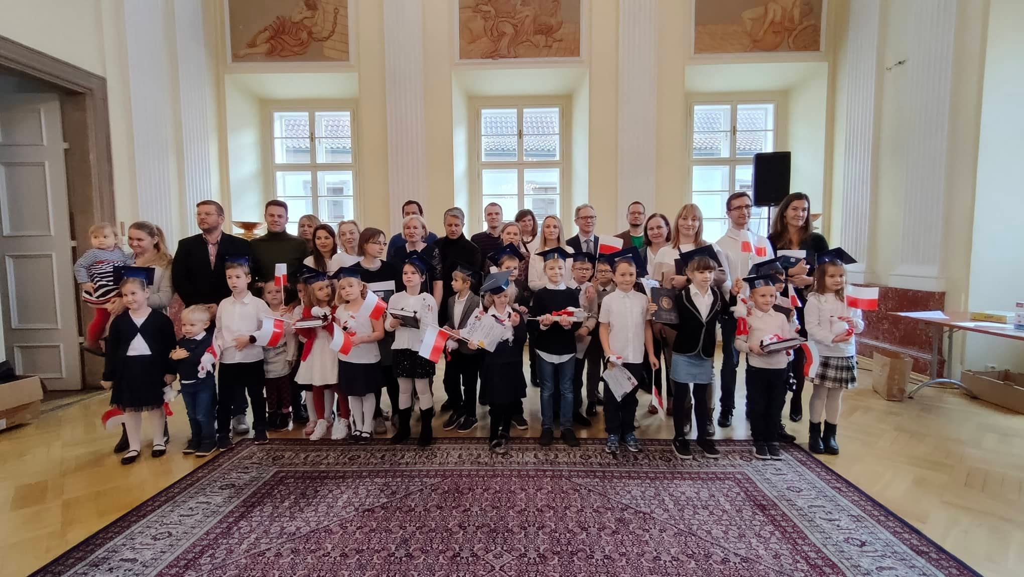 Za społecznością Szkoły Polskiej w Pradze dzień pełen wzruszeń. W reprezentacyjnej sali Ambasady RP w Pradze odbyła się piękna uroczystość. Był krakowiak i taniec z flagą, wierszyki o Polsce, piosenka o Wiśle i “jechał pociąg z daleka..”.