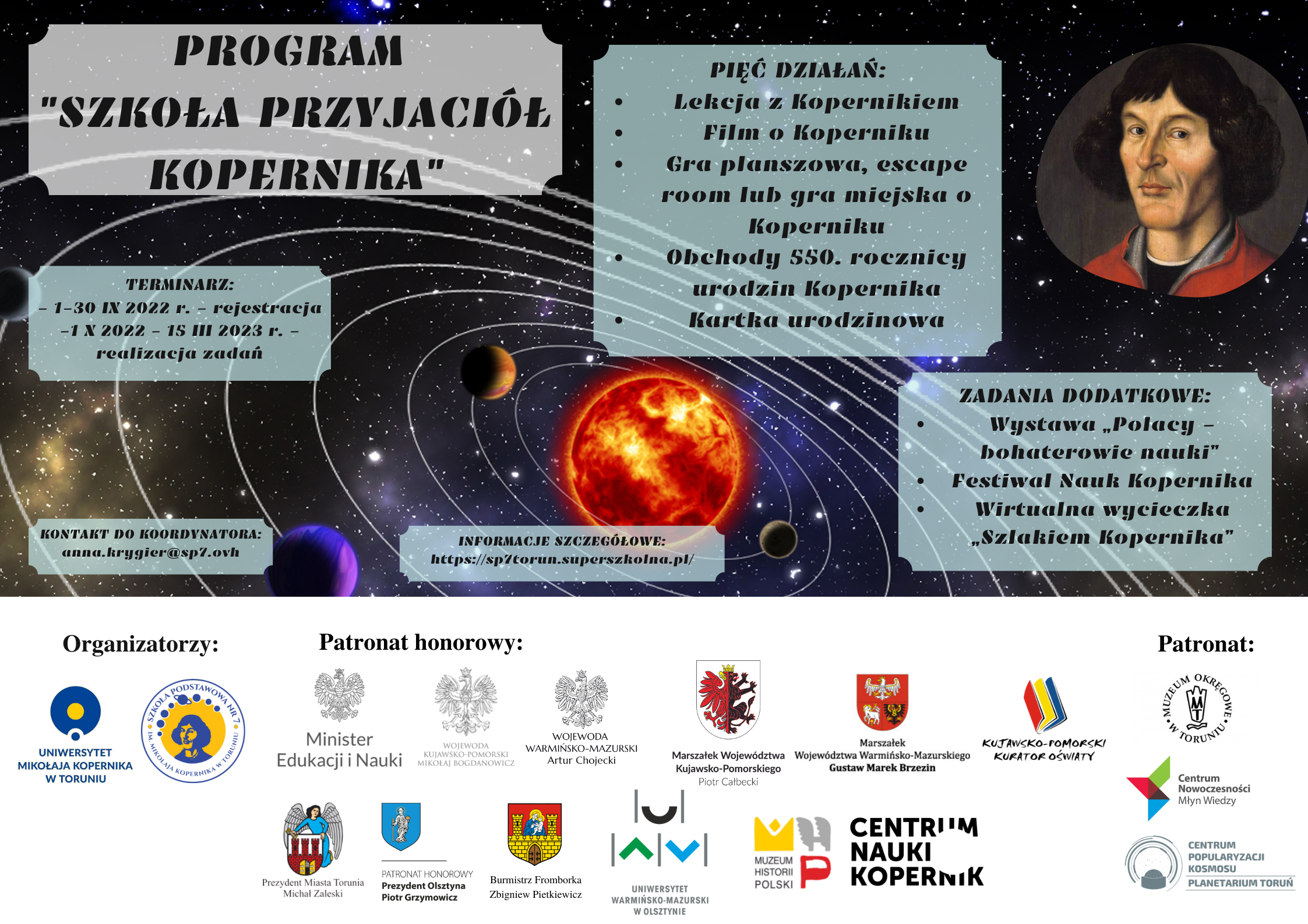 W 2023 roku świętujemy 550. rocznicę urodzin Mikołaja Kopernika. Uniwersytet Mikołaja Kopernika w Toruniu oraz Szkoła Podstawowa Nr 7 im. Mikołaja Kopernika w Toruniu zapraszają szkoły, w tym także szkoły polonijne, do udziału w Programie “Szkoła Przyjaciół Kopernika”.